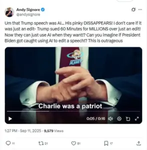 Donald Trump’s Oval Office address following the assassination of conservative activist Charlie Kirk has ignited a firestorm of controversy, with claims that the video was artificially generated using AI.