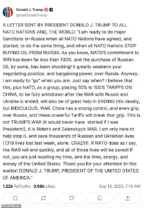 In a blistering post on Truth Social, Trump accused NATO nations of undermining their own negotiating leverage against Russia by continuing to purchase oil from Vladimir Putin’s regime.