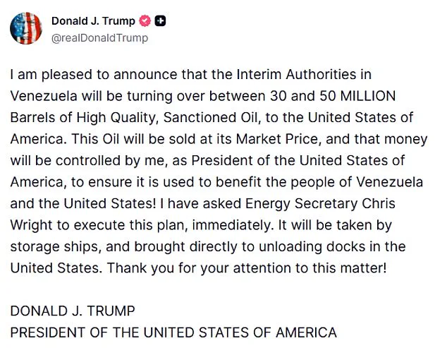 He claimed the proceeds would be managed by the U.S. government to ‘benefit the people of Venezuela and the United States,’ a move that has sparked both intrigue and skepticism among analysts and global observers.