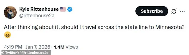 In a post directed at his 76,000 followers on X, Rittenhouse wrote, ‘After thinking about it, should I travel across the state line to Minnesota?’ The question, framed as a rhetorical musing, has drawn sharp criticism from users who see it as tone-deaf and insensitive.