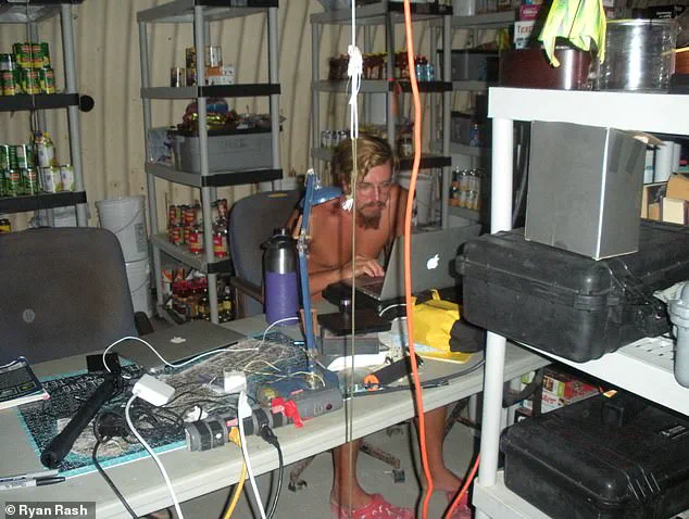 Ryan Rash, 30, on the island inside a Quonset hut on May 12, 2021.