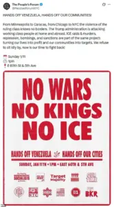 The group is explicitly linking the Minneapolis incident and Maduro’s capture, calling for protests in New York City on Sunday, January 11.