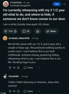 These families, often described as ‘white, blonde, blue-eyed, US citizens’ on social media, have shared their plans on platforms like Reddit, detailing how they are teaching their young children what to do if agents from Immigration and Customs Enforcement knock on their doors.