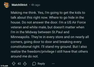Others, including a US Air Force Veteran, have joined the conversation, emphasizing their belief that ICE is ‘breaking every constitutional right’ and vowing to ‘stand my ground.’