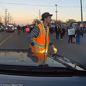 ‘The video clearly shows the individual holding onto the front of the trooper’s vehicle, lying down, then standing right back up afterwards and leaving the scene under his own power,’ a THP statement said. ‘At no point does the video show the individual being run over or injured, despite the narratives circulating on social media.’ The agency reiterated that while it respects the right to protest, entering active roadways poses a ‘serious and immediate risk’ to public safety.