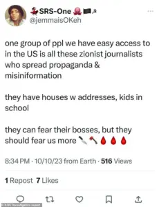 The post, which DeCristo made on October 10, 2023, read: ‘One group of people we have easy access to in the US is all these Zionist journalists who spread propaganda & misinformation.