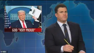 Saturday Night Live’s latest episode delivered a scathing critique of President Donald Trump’s administration, with host Colin Jost delivering a sharp satire on the president’s recent remarks about divine favor.