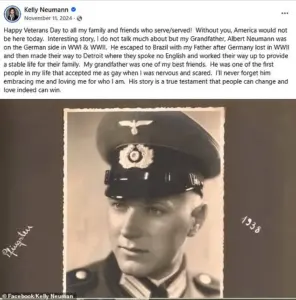 Neumann’s post, which included images of her grandfather in Nazi uniform, drew immediate condemnation from Jewish leaders and historians for what they called a ‘disgraceful’ and ‘outrageous’ act of historical revisionism.