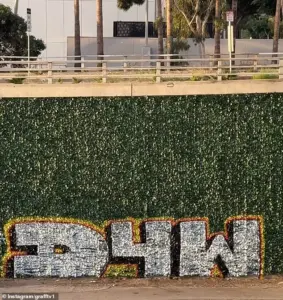 The agency emphasized that the ivy was part of a broader effort to deter graffiti while preserving murals at the site. ‘Due to a mural and related agreements at this location and several walls along US 101 in downtown Los Angeles, Caltrans is not legally allowed to paint over or remove graffiti,’ the statement read. ‘As a temporary measure, to protect the mural artworks, Caltrans has been installing artificial ivy which has aesthetic benefits and acts as a graffiti deterrent and is a more environmentally friendly solution to graffiti removal.’