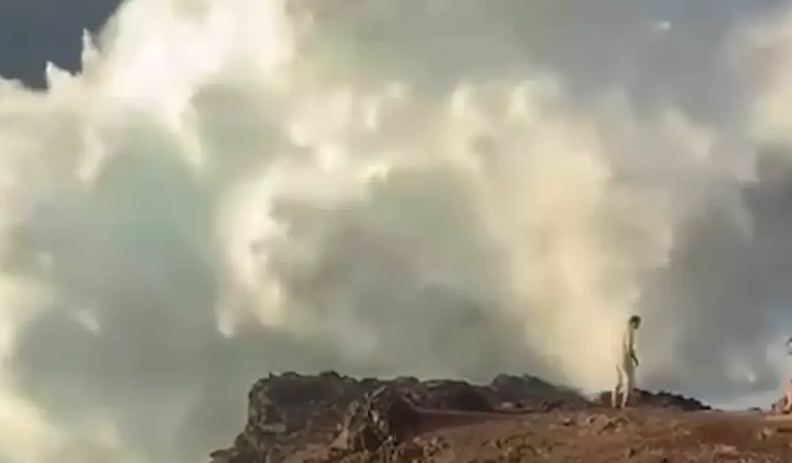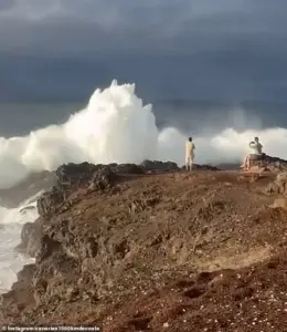 The wave, which struck with little warning, sent a wall of water crashing onto the platform, drenching the tourists and forcing them to flee for higher ground. One man stood frozen, watching the tempest with his phone raised, while a woman sat beside him, filming the spectacle as if it were a momentary thrill. Within seconds, the wave transformed from a curiosity into a deadly threat, sweeping through the ledge with a force that left the group scrambling for survival.