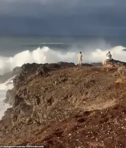 A group of tourists in the Canary Islands narrowly escaped death after a monstrous wave surged across a rocky ledge during a violent storm. Footage captured near the Faro de Sardina del Norte on Gran Canaria showed the tourists standing dangerously close to the cliff’s edge, their phones raised to document the chaos. The ledge, which drops over 66ft, is surrounded by warning signs and barriers meant to keep visitors safe—yet the group had ignored them, climbing through protective fencing to reach the site.
