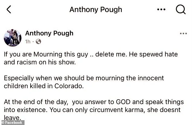 He spewed hate and racism on his show,’ Pough wrote in the post, which was later removed.
